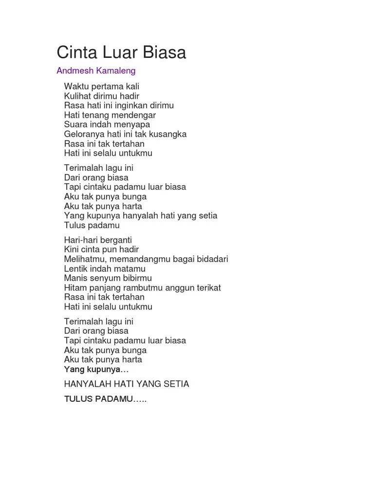 Waktu pertama kali ku lihat dirimu hadir rasa hati ini inginkan dirimu hati tenang mendengar suara i. Lirik lagu cinta luar biasa andmesh kamaleng : Lantas bagaimana lirik lengkap dari lagu cinta luar biasa, simak di bawah ini: Rasa hati ini inginkan dirimu